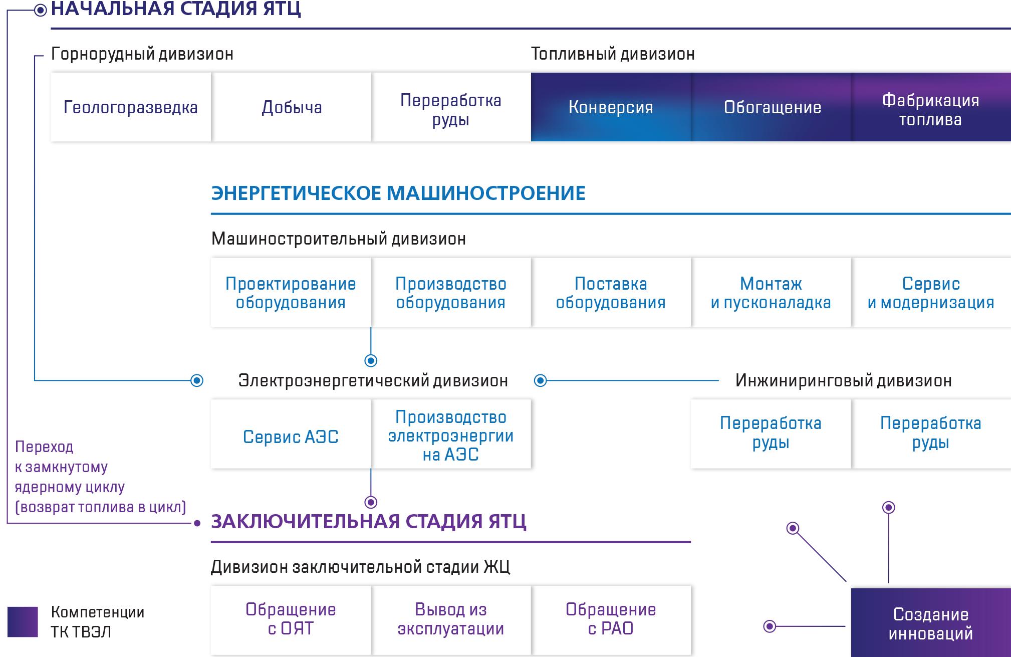 Объединяя активы топливного дивизиона Госкорпорации «Росатом», Компания включает в себя предприятия по фабрикации ядерного топлива (ЯТ), конверсии и обогащению урана, производству газовых центрифуг, а также научно-исследовательские и конструкторские организации.