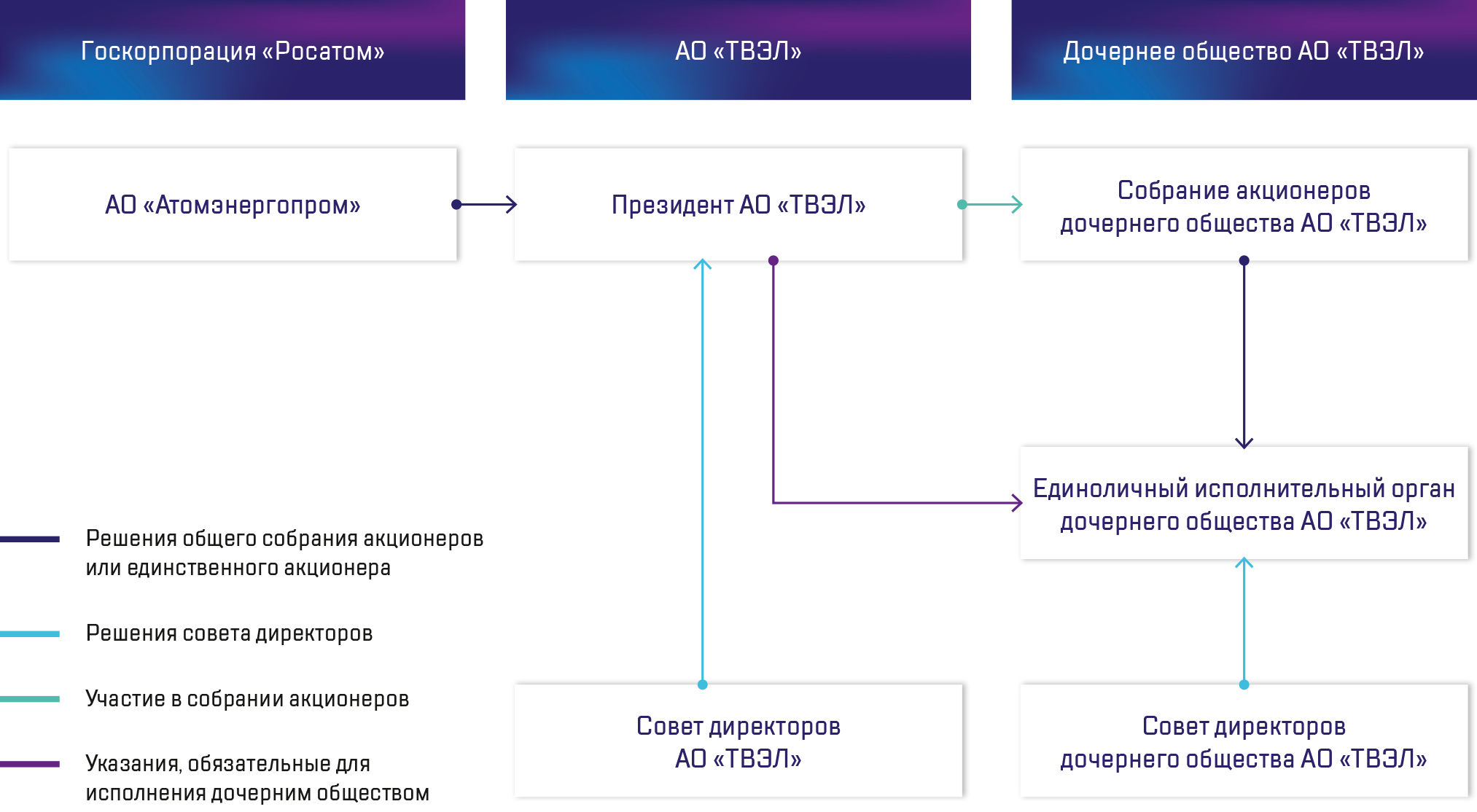Значительная роль в управлении дочерними обществами отведена их Советам директоров, компетенция которых отражает важнейшие вопросы деятельности. Подготовка заседаний Советов директоров дочерних обществ осуществляется с привлечением структурных подразделений АО «ТВЭЛ» для проработки материалов по вопросам повестки дня и выработки проектов решений.