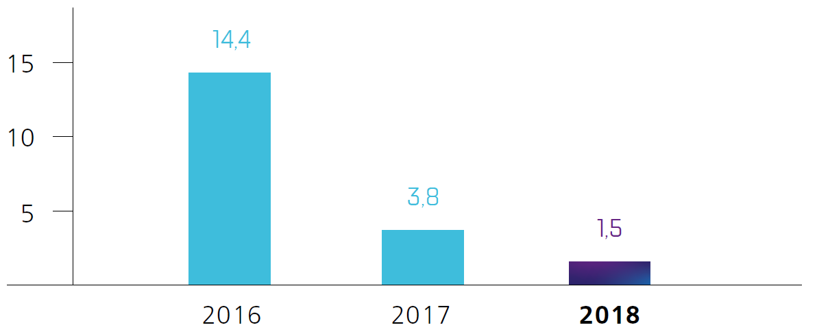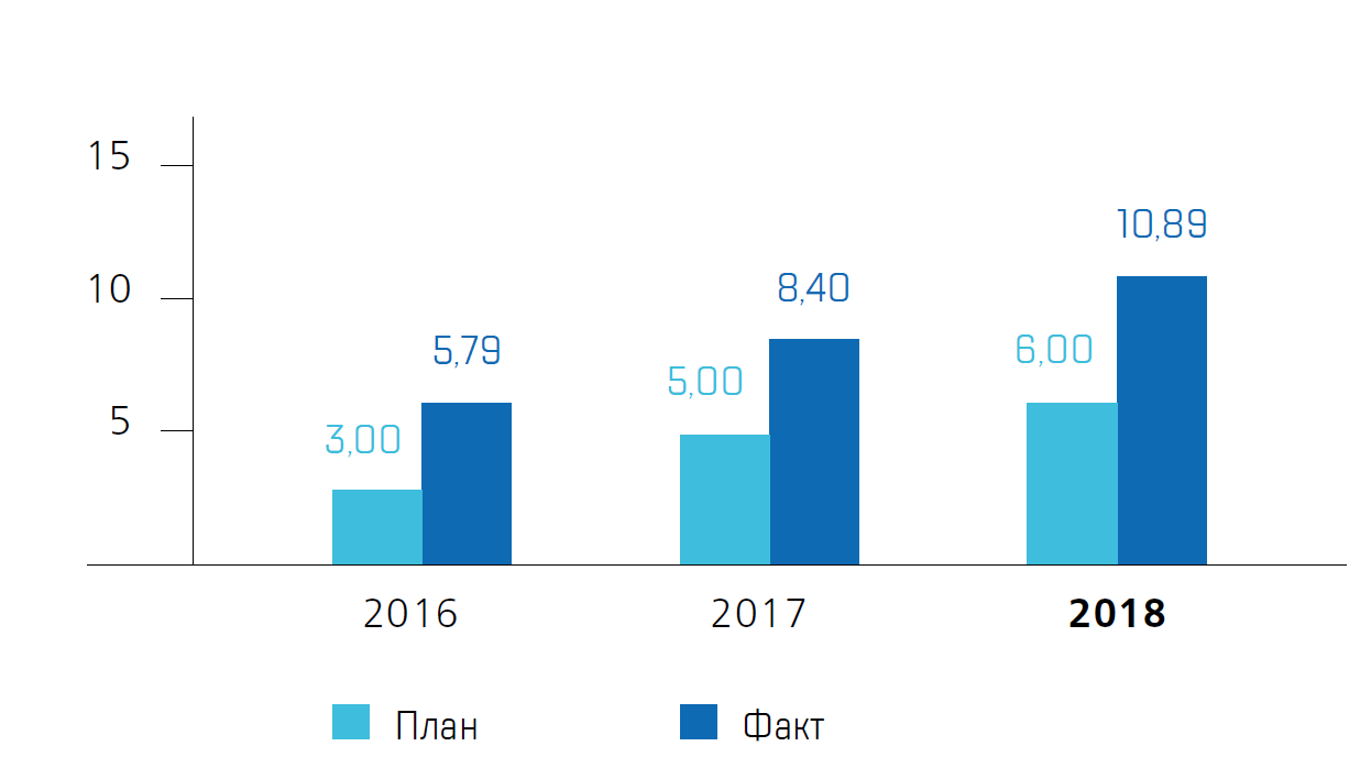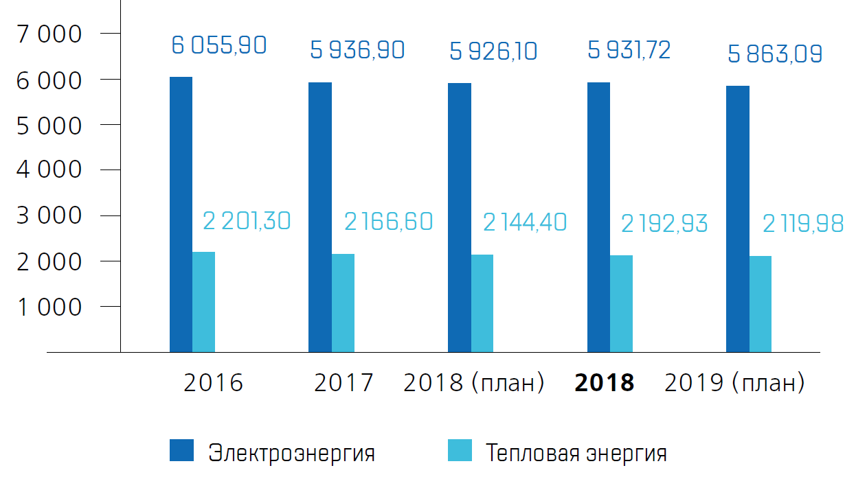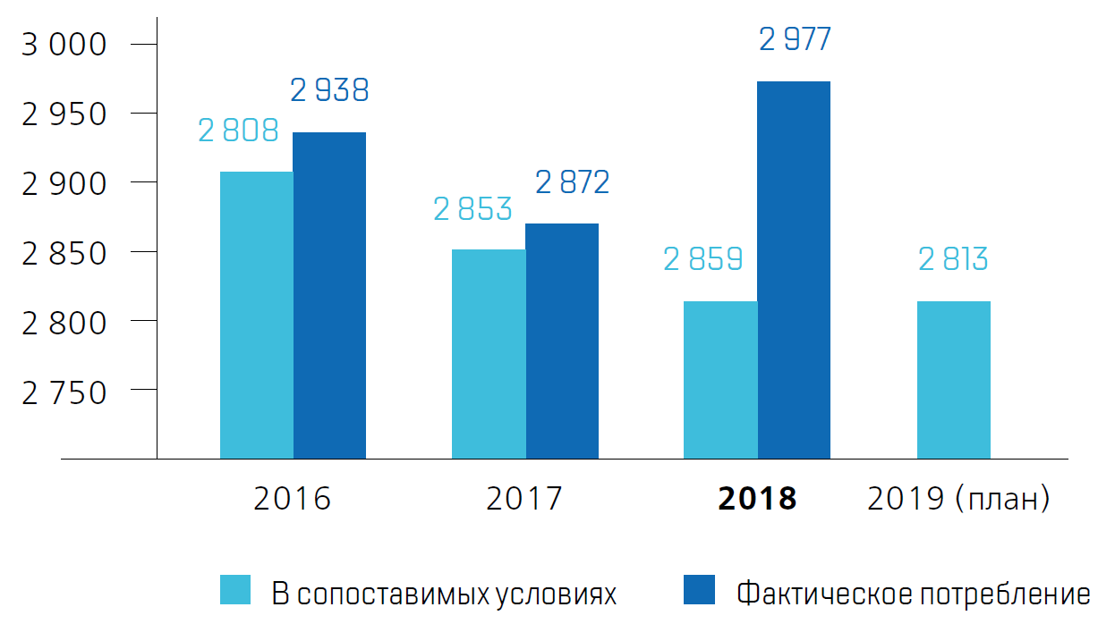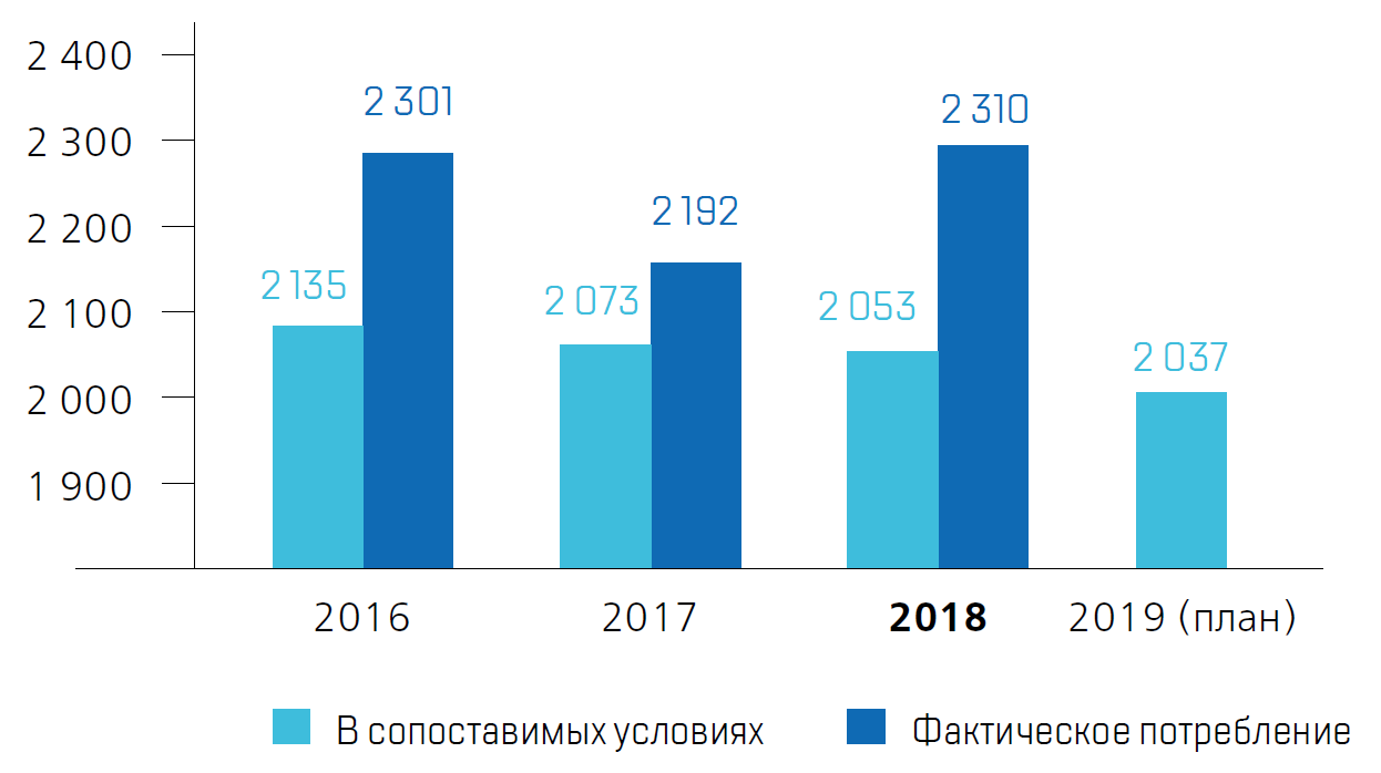 В 2018 году потребление электроэнергии в обществах, входящих в контур управления Топливной компании ТВЭЛ было снижено на 5,49% (165,99 млн кВт·час), тепловой энергии – на 12,3% (288,04 тыс. Гкал) по отношению к базовому 2015 году в сопоставимых условиях*. Снижение потребления энергоресурсов (в сопоставимых условиях к 2015 году) в стоимостном выражении составило 10,89% (1 082 млн руб.) при целевом показателе в 6%.