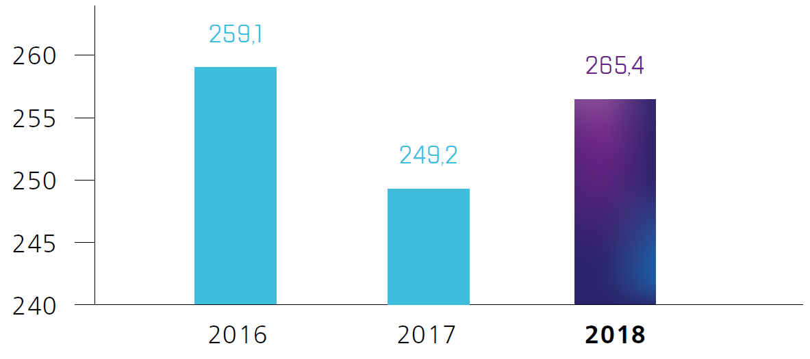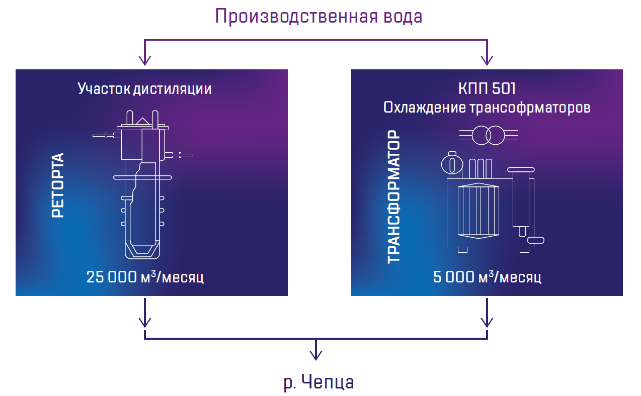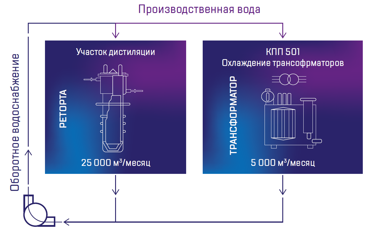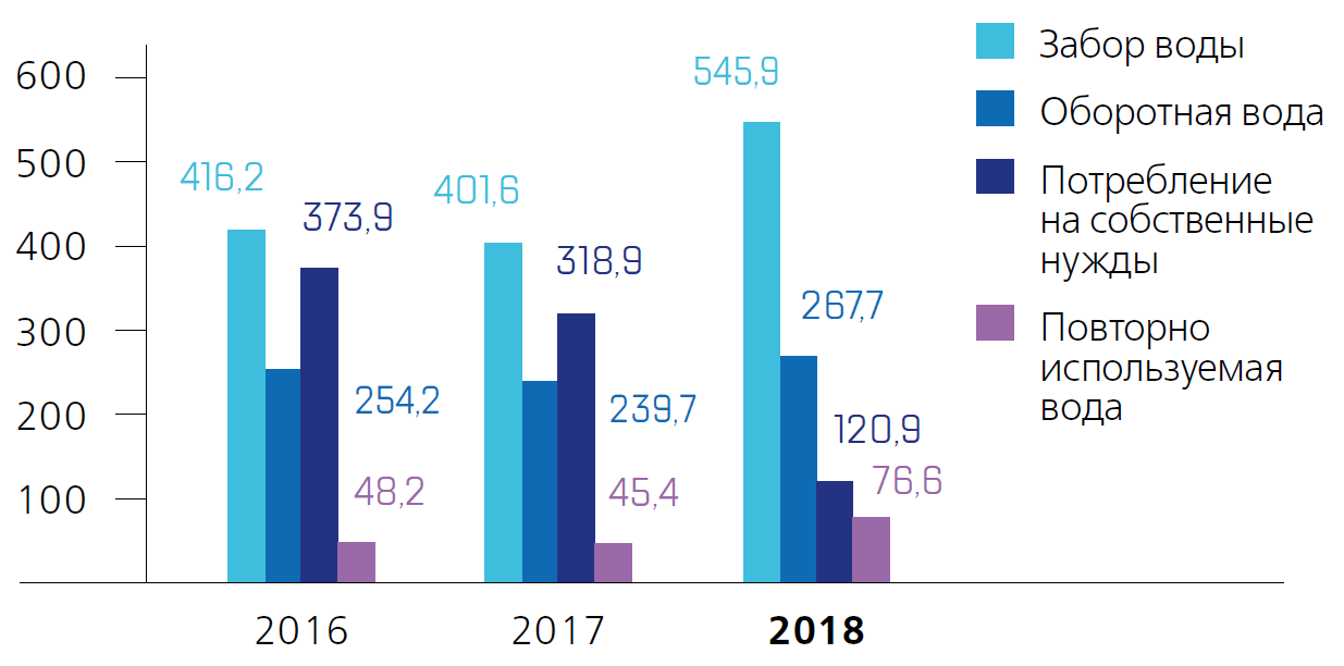 Объем оборотной воды в 2018 году составил 267,7 млн м3. Доля оборотной воды от общего количества забираемой воды составила 49%, доля повторно использованной воды от общего объема забираемой воды – 14%.