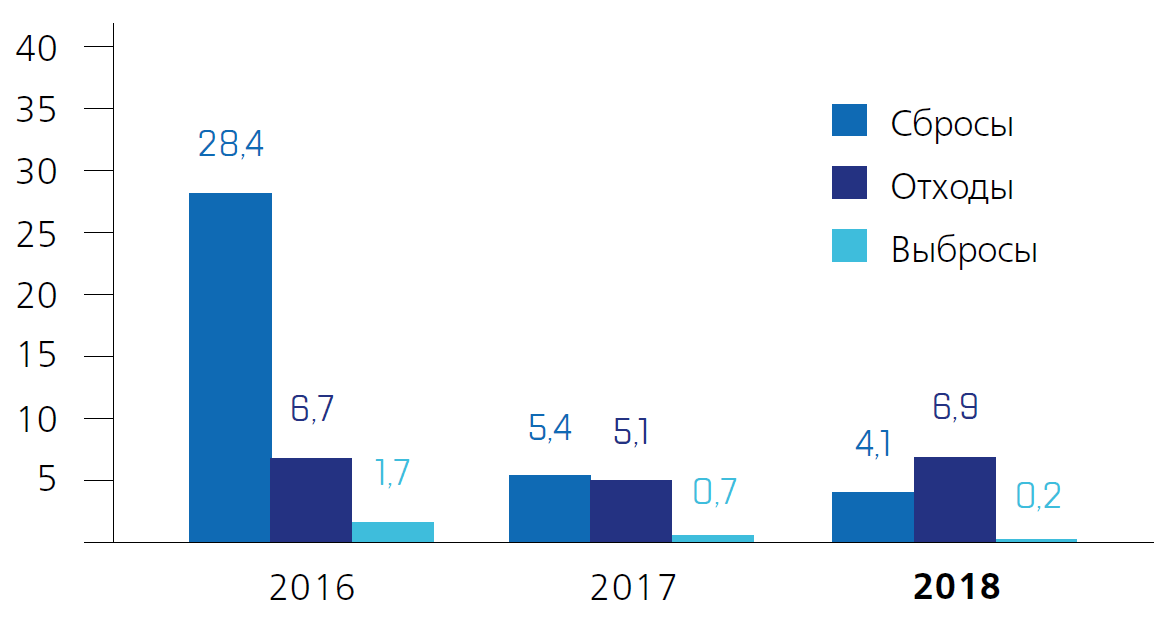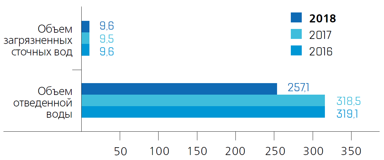 В 2018 году забор воды предприятиями Компании увеличился на 36% и составил 545,9 млн м3, объем потребления воды на собственные нужды уменьшился на 62% и составил 120,9 млн м3. В результате предприятиями Компании было отведено в водные объекты 257,1 млн м3 воды (58,2% от норматива), что составляет основную долю водоотведения.