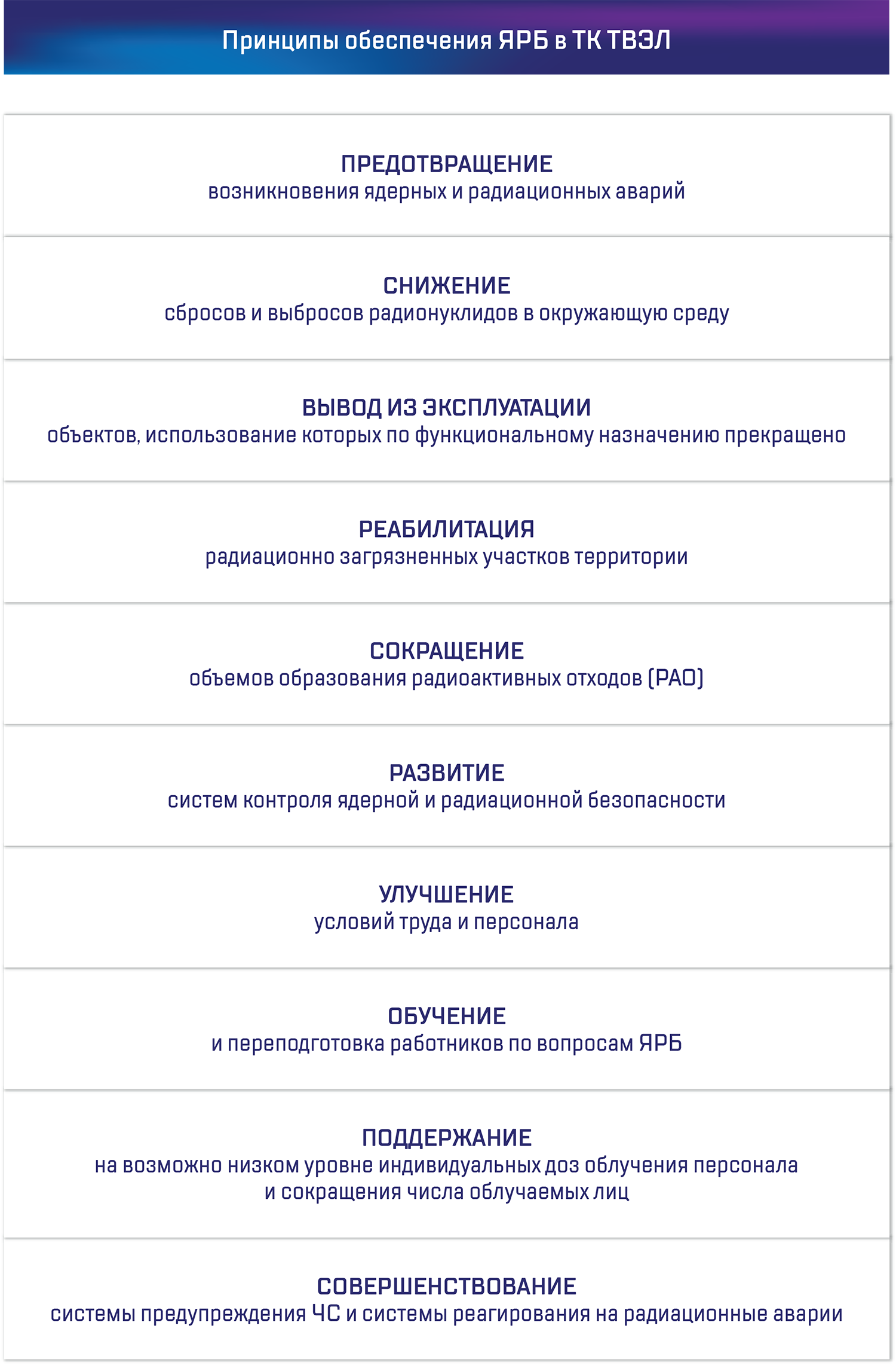 В Компании на всех стадиях жизненного цикла объектов использования атомной энергии реализуется концепция глубокоэшелонированной защиты, основанной на применении системы физических барьеров на пути распространения в окружающую среду ионизирующего излучения.