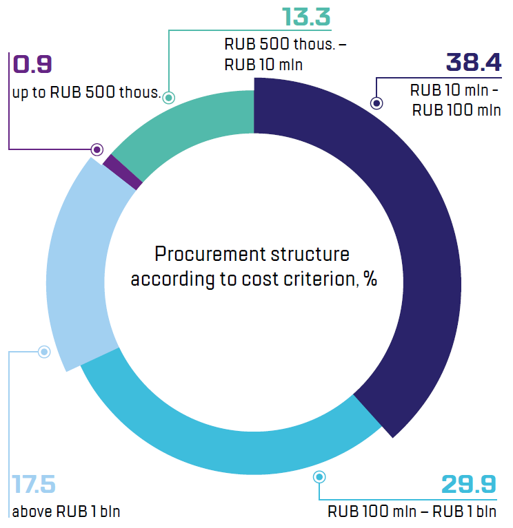 In 2018, total amount of procurement was 8.1% higher compared to previous year and amounted to RUB 102.9 bln, while savings resulting from procurement procedures on an open competitive basis made RUB 2.0 billion.