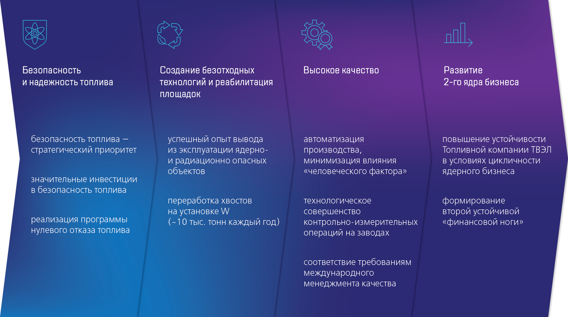 За счет развития неядерного бизнеса достигается финансовая устойчивость Компании в условиях вызовов и меняющейся рыночной конъюнктуры на рынках НС ЯТЦ, создаются дополнительные рабочие места. В 2018 году на базе Топливной компании ТВЭЛ был создан ряд отраслевых интеграторов по новым бизнесам.